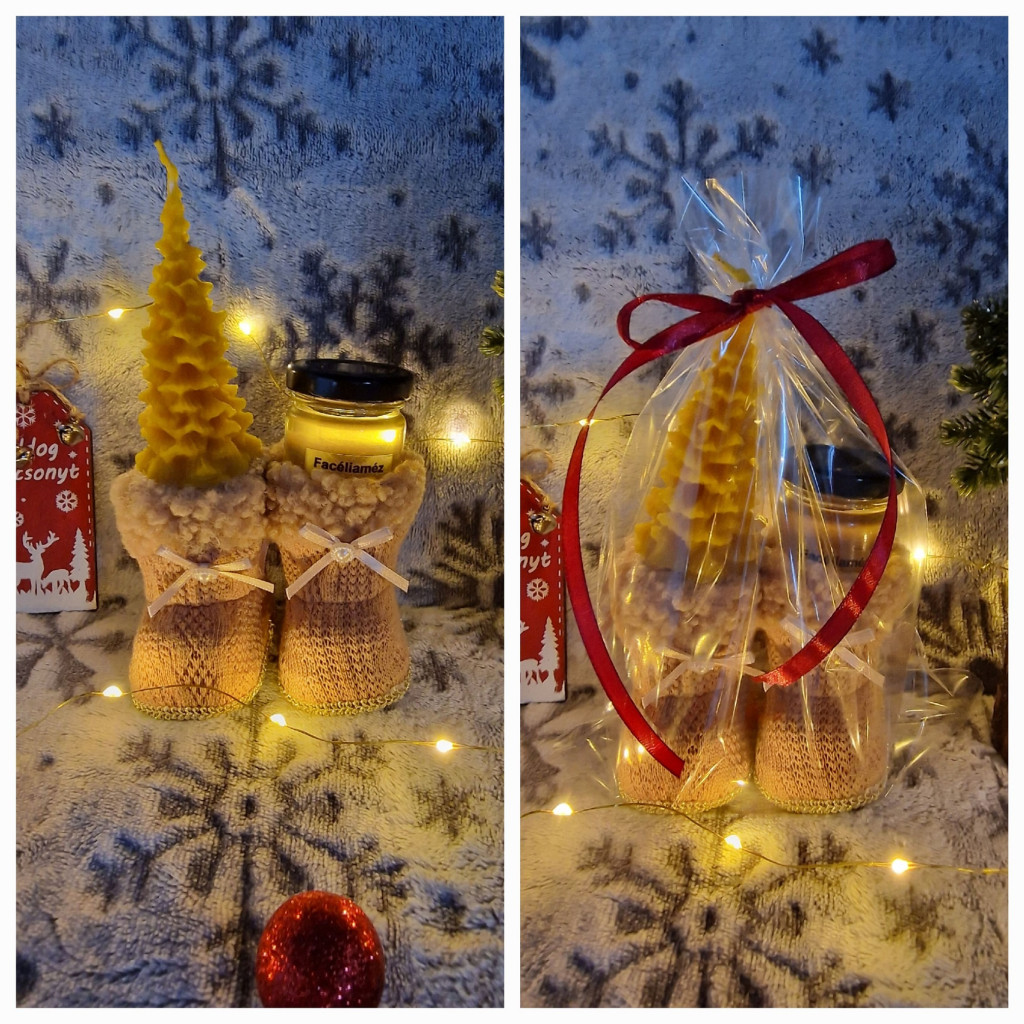 Kiscipőben celofánba csomagolva facéliaméz (50g) és méhviasz fenyőfa gyertya