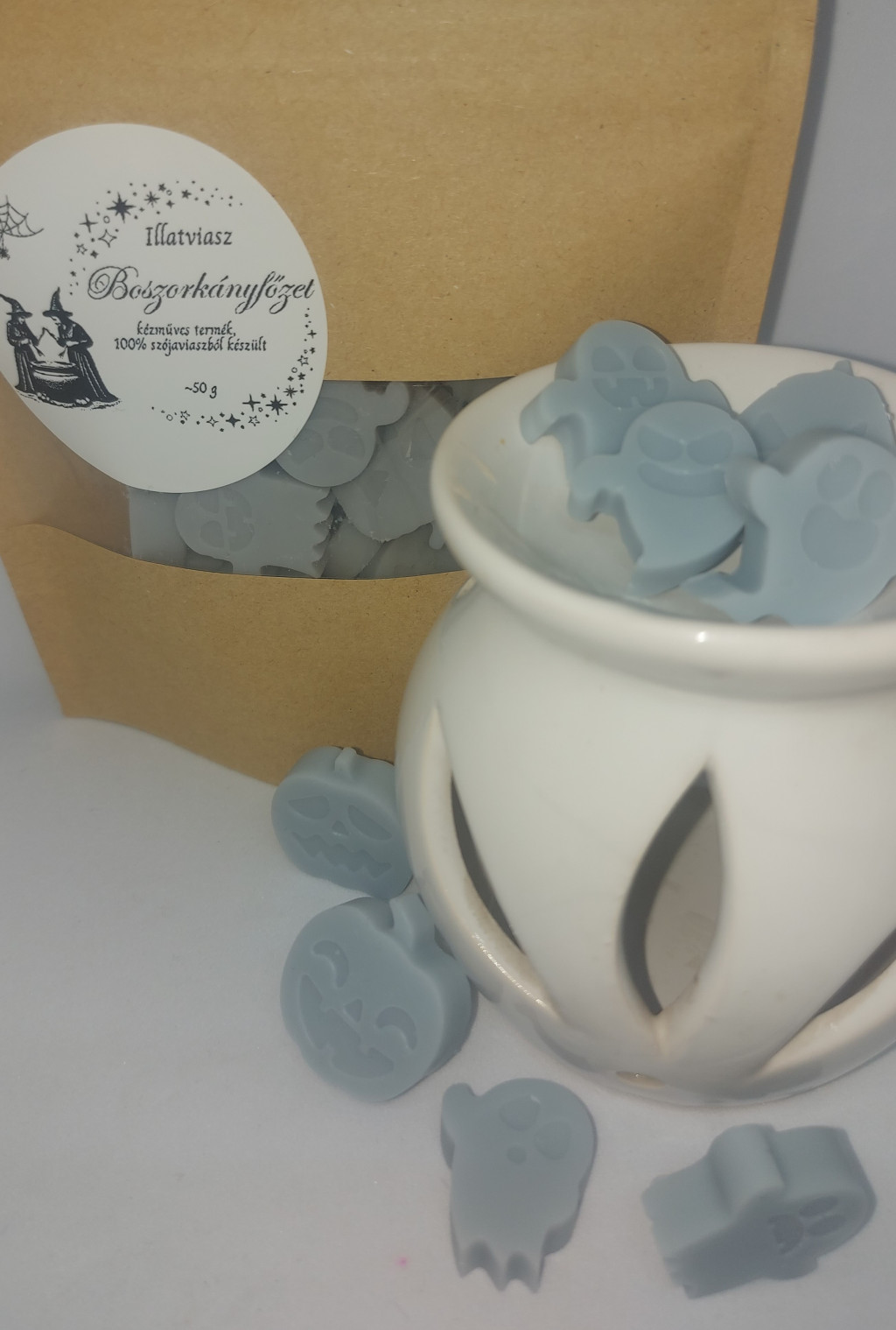 Boszorkányfőzet szójaviasz illatviaszainkkal érezd a varázslatot otthonodban. Az apró kis szellemek és töklámpások szójaviaszból készültek, illatuk egyszerre titokzatos, fűszeres és csábító, mintha csak egy boszorkány gyújtana tüzet az erdőben éjszaka, hogy elkészítse titkos varázsfőzetét. Illatviaszaink magukban is fantasztikus illatot varázsolnak a helyiségbe, de párologatatóban megolvasztva a legintenzívebbek. Illatviaszaink kiemelkedő minőségű, természetes szójaviaszból készülnek, égetésük során nem kerülnek a levegőbe toxikus anyagok és kőolajszármazékok. A szójaviasz 100% természetes, megújuló és vegán, szójababból származó növényi olaj és a legjobb alternatíva azoknak, akik számára fontos a környezettudatos és egészséges otthon. Minden illatviaszunk kézzel készül, emiatt nincs két teljesen egyforma. Minden csomag illatviaszhoz ajándéba adunk egy szintén kézzel, szójaviaszból, illatosítás nélklül készült teamécsest, hogy párologatatód valóban környezetbarát módon váljon a kikapcsolódás pillanatainak aktív szereplőjévé. A gyertya használata során kérjük figyelj a biztonsági szabályok betartására: - Soha ne hagyd felügyelet nélkül az égő gyertyát - Gyermekektől és háziállatoktól elzárva tartsd - Mindig hagyj legalább 10 cm távolságot a gyertyák között - Ne égesd olyan tárgyon vagy annak közelében, ami meggyulladhat - Soha ne égjen a gyertyád egyszerre 4 óránál tovább - Mindig oltsd el a gyertyát, és ne gyújtsd újra, ha a viasz szintje 1 cm-nél kisebb. Kb. 50g A fotón szereplő párologtató csak dekoráció.