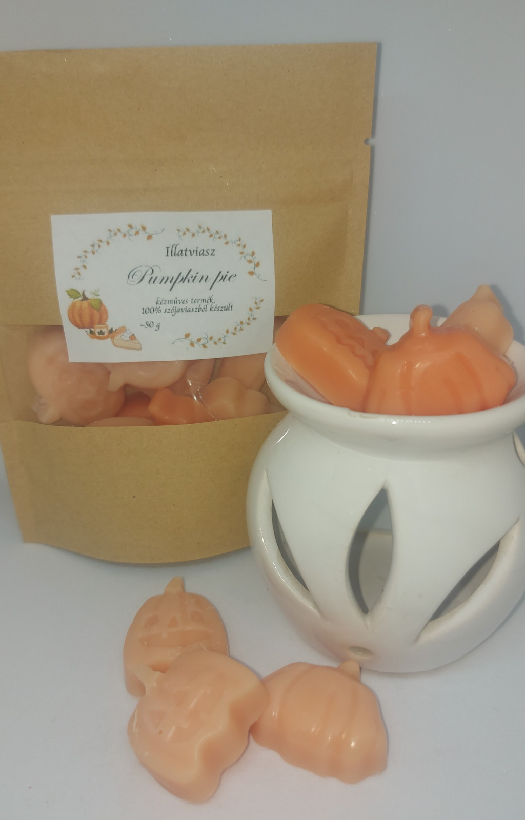Pumpkin Pie szójaviasz illatviaszainkkal valódi őszi hangulatot varázsolhatsz otthonodba. Az apró sütőtökök szójaviaszból készültek, illatuk sütőtökös, fűszres, édes - kihagyhatatlan, igazi kuckózós illat. Illatviaszaink magukban is fantasztikus illatot varázsolnak a helyiségbe, de párologatatóban megolvasztva a legintenzívebbek. Illatviaszaink kiemelkedő minőségű, természetes szójaviaszból készülnek, égetésük során nem kerülnek a levegőbe toxikus anyagok és kőolajszármazékok. A szójaviasz 100% természetes, megújuló és vegán, szójababból származó növényi olaj és a legjobb alternatíva azoknak, akik számára fontos a környezettudatos és egészséges otthon. Minden illatviaszunk kézzel készül, emiatt nincs két teljesen egyforma. Minden csomag illatviaszhoz ajándéba adunk egy szintén kézzel, szójaviaszból, illatosítás nélklül készült teamécsest, hogy párologatatód valóban környezetbarát módon váljon a kikapcsolódás pillanatainak aktív szereplőjévé. A gyertya használata során kérjük figyelj a biztonsági szabályok betartására: - Soha ne hagyd felügyelet nélkül az égő gyertyát - Gyermekektől és háziállatoktól elzárva tartsd - Mindig hagyj legalább 10 cm távolságot a gyertyák között - Ne égesd olyan tárgyon vagy annak közelében, ami meggyulladhat - Soha ne égjen a gyertyád egyszerre 4 óránál tovább - Mindig oltsd el a gyertyát, és ne gyújtsd újra, ha a viasz szintje 1 cm-nél kisebb. Kb. 50g A fotón szereplő párologtató csak dekoráció.