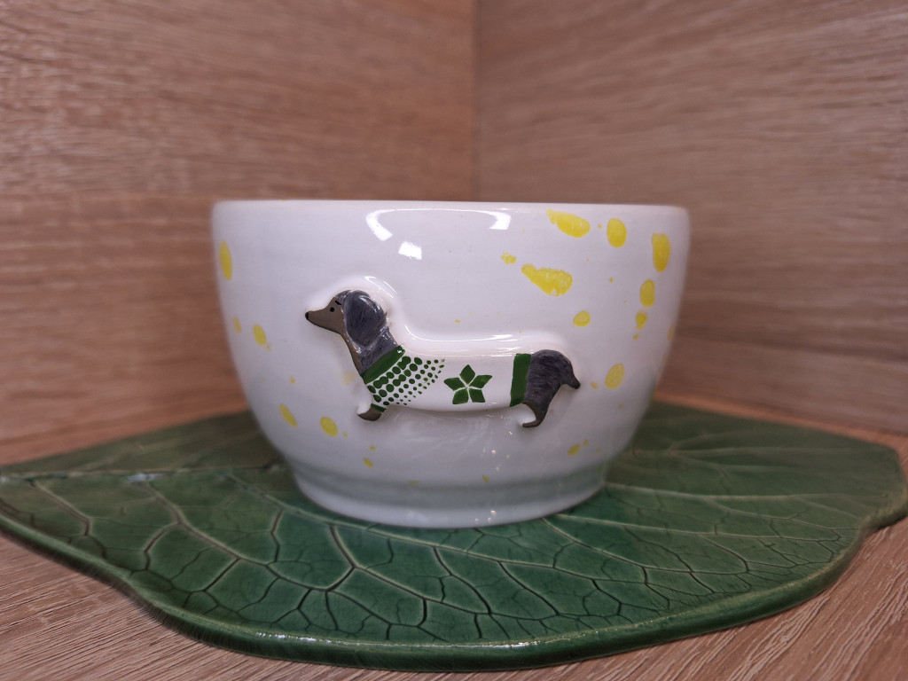 Egyedi kerámia kávés-/ teás csésze. Fehér alapon citromsárga foltos máz borítja. A bögre elején egy cuki karácsonyi pulcsis tacskó. Űrtartalom: 2,5dl A terméket hagyományos kerámia technológiával készítjük, mázazzuk és kemencében égetjük. A kép tájékoztató jellegű! Mivel kézzel készítjük, ezért formában, méretben és színárnyalatban minimálisan eltérő lehet!