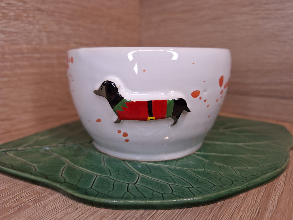 Egyedi kerámia kávés-/ teás csésze. Fehér alapon piros foltos máz borítja. A bögre elején egy cuki karácsonyi pulcsis tacskó. Űrtartalom: 2,5dl A terméket hagyományos kerámia technológiával készítjük, mázazzuk és kemencében égetjük. A kép tájékoztató jellegű! Mivel kézzel készítjük, ezért formában, méretben és színárnyalatban minimálisan eltérő lehet!