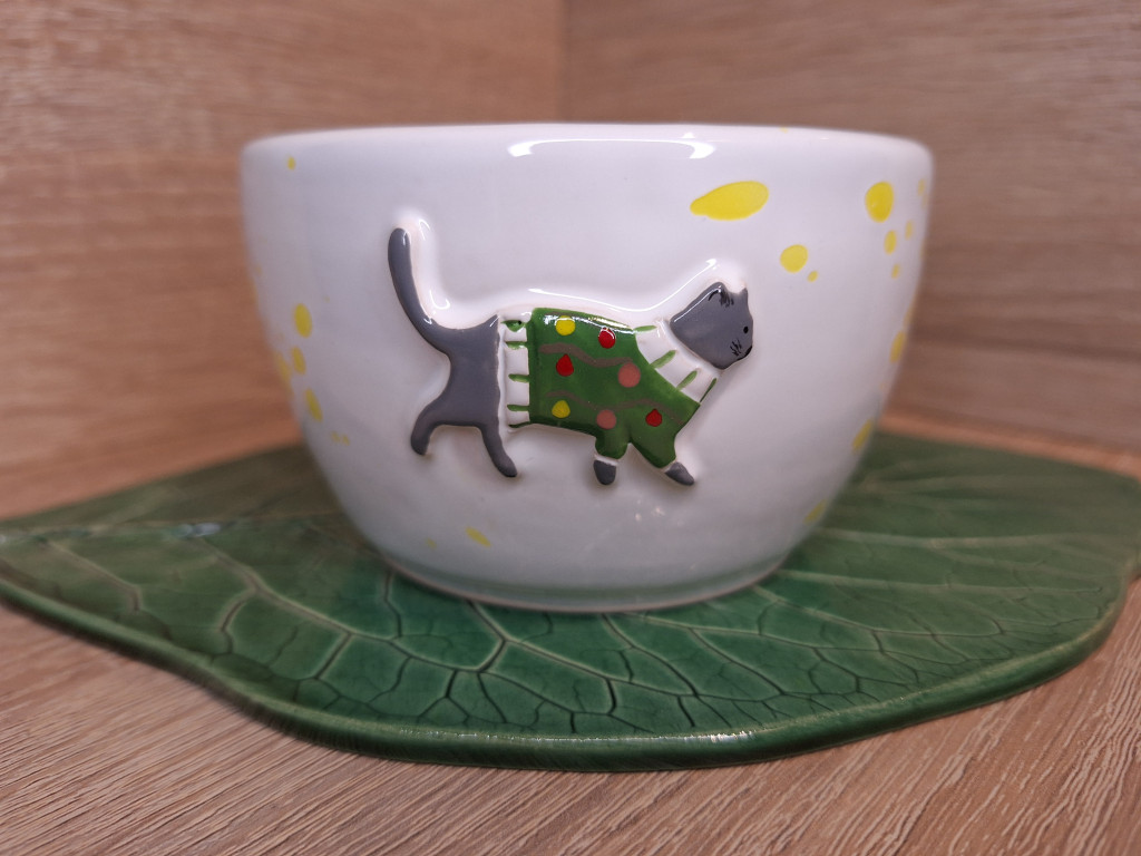 Egyedi kerámia kávés-/ teás csésze. Fehér alapon citromsárga foltos máz borítja. A bögre elején egy cuki karácsonyi pulcsis cica. Űrtartalom: 2,5dl A terméket hagyományos kerámia technológiával készítjük, mázazzuk és kemencében égetjük. A kép tájékoztató jellegű! Mivel kézzel készítjük, ezért formában, méretben és színárnyalatban minimálisan eltérő lehet!