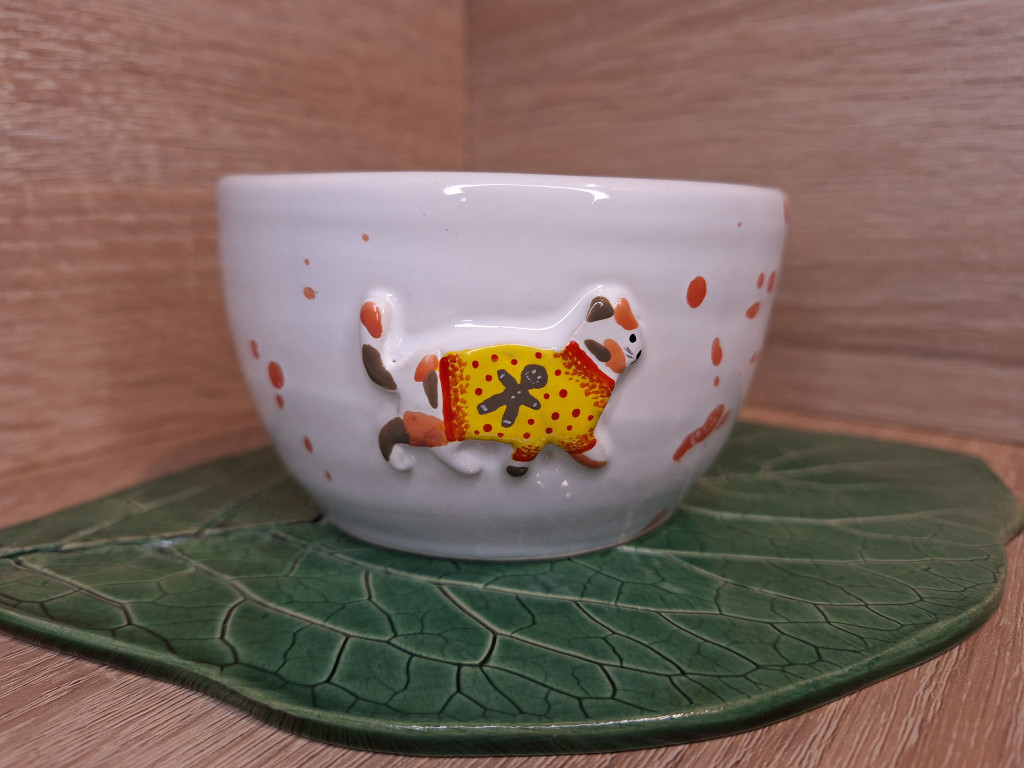 Egyedi kerámia kávés-/ teás csésze. Fehér alapon narancssárga foltos máz borítja. A bögre elején egy cuki karácsonyi pulcsis cica. Űrtartalom: 2,5dl A terméket hagyományos kerámia technológiával készítjük, mázazzuk és kemencében égetjük. A kép tájékoztató jellegű! Mivel kézzel készítjük, ezért formában, méretben és színárnyalatban minimálisan eltérő lehet!