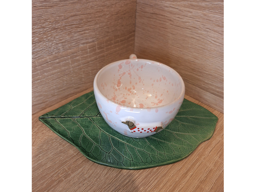 A bögre elején egy cuki karácsonyi pulcsis tacskó.