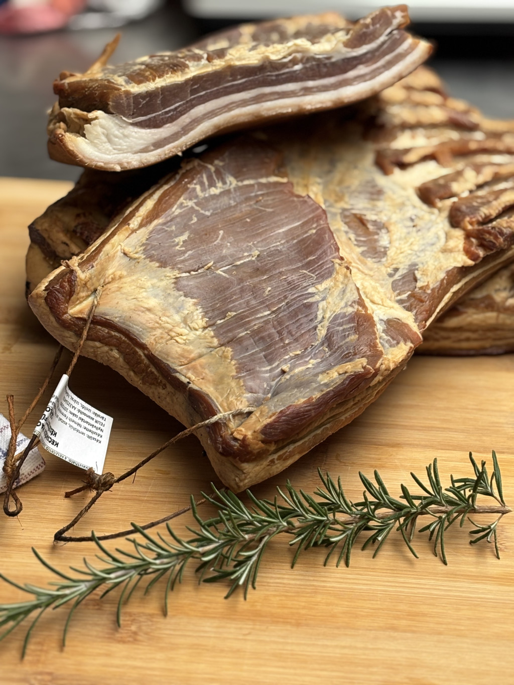 KRIMBO Angolszalonna SZELETELT, cca.2x 80g - hosszú érleléssel készült, füstölt, levegőn szárított bőrös karaj - Összetevők: sertés bőrös csont nélküli karaj, tengeri só, fűszerek, ivóvíz Hozzáadott tartósítószert és adalékanyagot nem tartalmaz! Gyártó: Meatos Húsműhely Kft. 9121 Győrszemere, Liget u.7. e-mail: meatos.food@gmail.com Átlagos tápérték 100g termékben* Energia: 975 kJ/ 235 kcal Zsír: 19 g, amelyből telített zsírsav: 7,6 g Szénhidrát: 0g, amelyből cukor: 0g Fehérje: 16 g, Só: 3,5g *A feltüntetett tápérték adatok tájékoztató jellegűek, ingadozásuk előfordulhat. Tárolás: 20°C alatt, száraz, hűvös helyen, függesztve - 1 db Angolszalonna tömege: cca. 70- 120g A pontos vételár a megrendelt termék mérése után lesz meghatározva! A legnagyobb elismerés, ha visszatérsz. - KRIMBO
