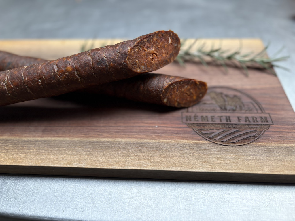 1 rúd kb. 75-80 dkg. Saját receptúra alapján készült: marhahús, sertés szalonna, asztali só, piros paprika, bors, kömény, fokhagyma, őrölt borókabogyó, szerecsendió és szegfűbors felhasználásával. Fogyasztható: készítéstől számított 2 hónapig. Tárolása: száraz, hűvös helyen. Súlykorrekció történik a termék lemérését követően.