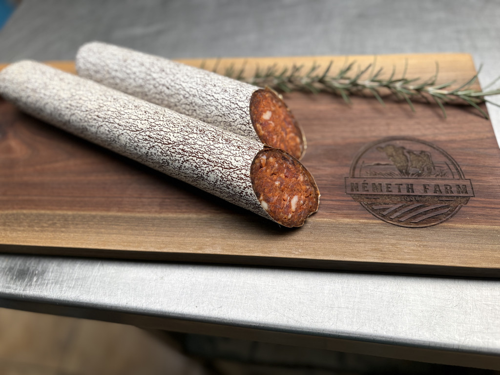 Saját receptúra alapján készült: marhahús, sertés szalonna, asztali só, piros paprika, bors, kömény, fokhagyma, szerecsendió és szegfűbors felhasználásával. Fogyasztható: készítéstől számított 2 hónapig. Tárolása: száraz, hűvös helyen. Súlykorrekció történik a termék lemérését követően.